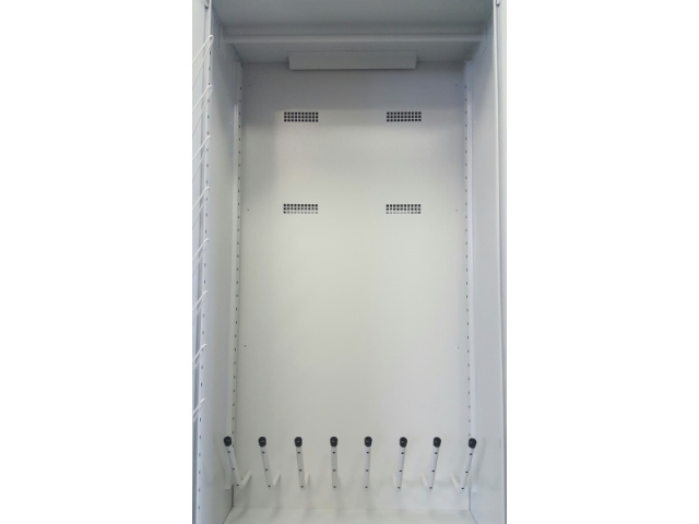 Součástí vysoušecí skříně jsou závěsné háky na obuv, závěsné háčky na rukavice a tyč pro zavěšení kabátů a bund. Skříň je určena pro vysoušení například pracovní obuvi, rukavic a plášťů, sportovní obuvi, rukavic a dresů, atd.