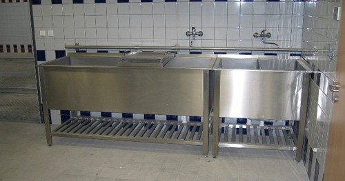 Umývacie stoly môžeme osadiť lisovanými alebo zváranými drezami aj s batériami a drvičmi odpadkov. Lisované drezy vevarujeme do pracovných dosiek na našom robotizovanom pracovisku. Ponúkame rôzne veľkosti drezov a prispôsobujeme sa prianiam zákazníkov. V pracovnej doske je možné osadiť aj viac drezov. Pracovné skrinky vyrábame otvorené alebo osadené posuvnými dvierkami z nerezu alebo skla. Posuvné dvierka sú opatrené aretáciou pri uzatváraní. Police ponúkame jedno, dvoj alebo trojposchodové. Prevedenie je opäť celonerezové. Regály dodávame v štandardnom prevedení troj, štvor alebo viacpolicové s plnou odkladnou plochou.