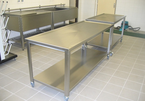 Stoly k umývačkám vyrábame v niekoľkých základných prevedeniach. Jedná sa o jednoduché odkladacie stoly, odkladacie stoly s drezom, odkladacie stoly s drezom a golierom, valčekové stoly. Stoly môžu mať spodnú odkladaciu plochu v roštovom prevedení.